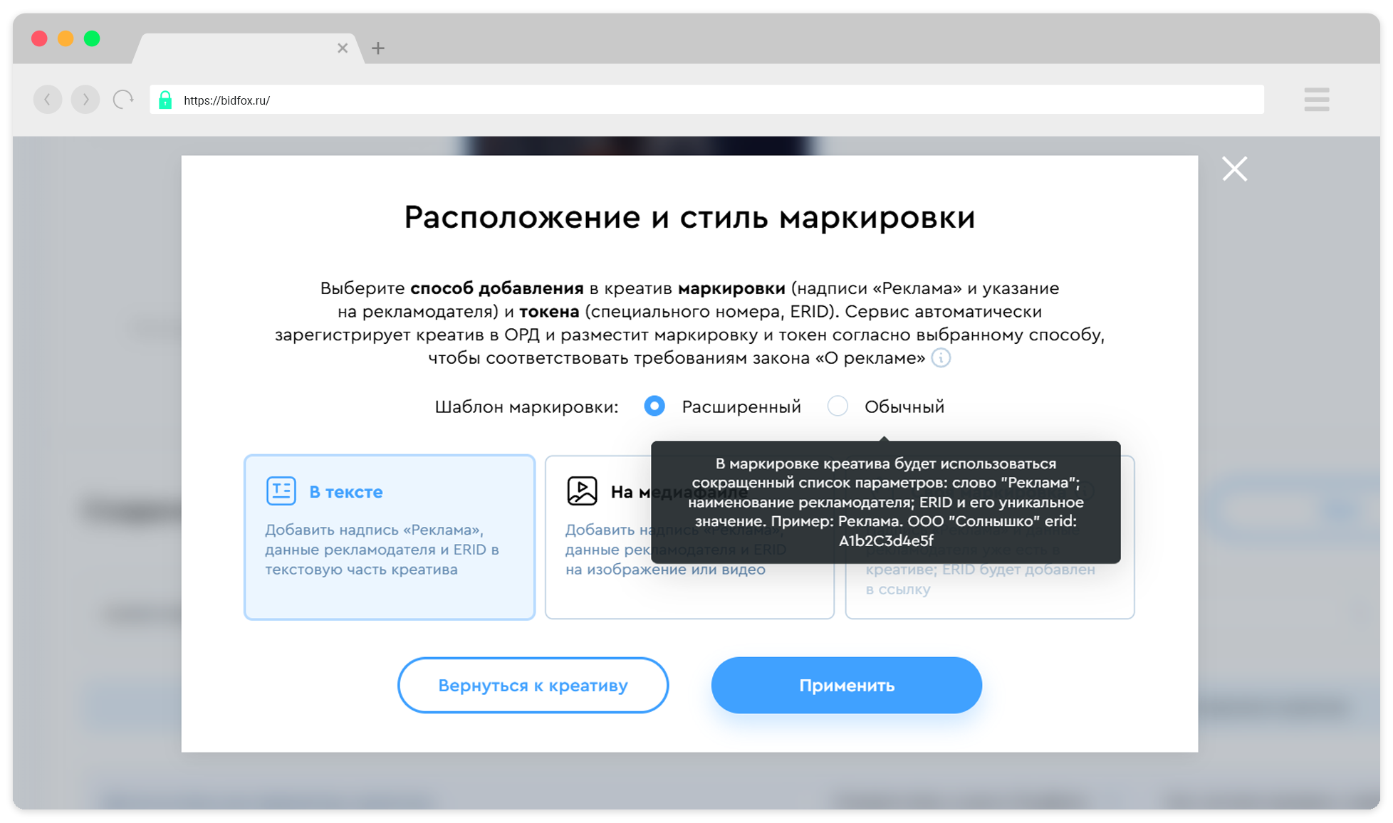 В сервисе BidFox появилась полезная опция — теперь при создании рекламного креатива можно выбрать один из двух шаблонов маркировки в соответствии с требованиями закона «О рекламе».