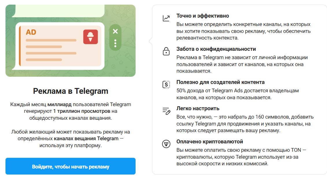 Но у официальной рекламы телеграма высокий минимальный входной порог – от 500€ + оплата НДС.