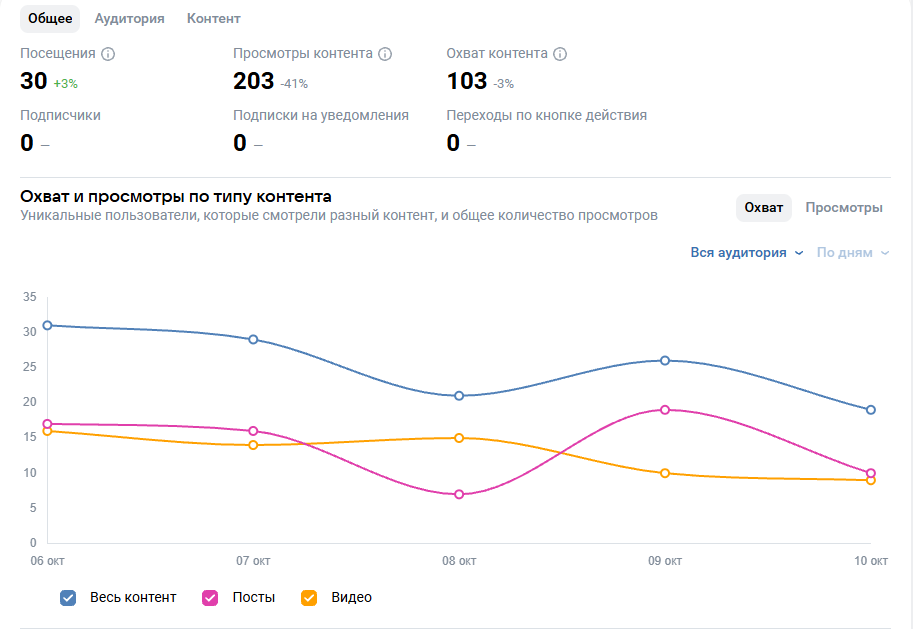 Статистика охвата и просмотров по типу контента в ВКонтакте