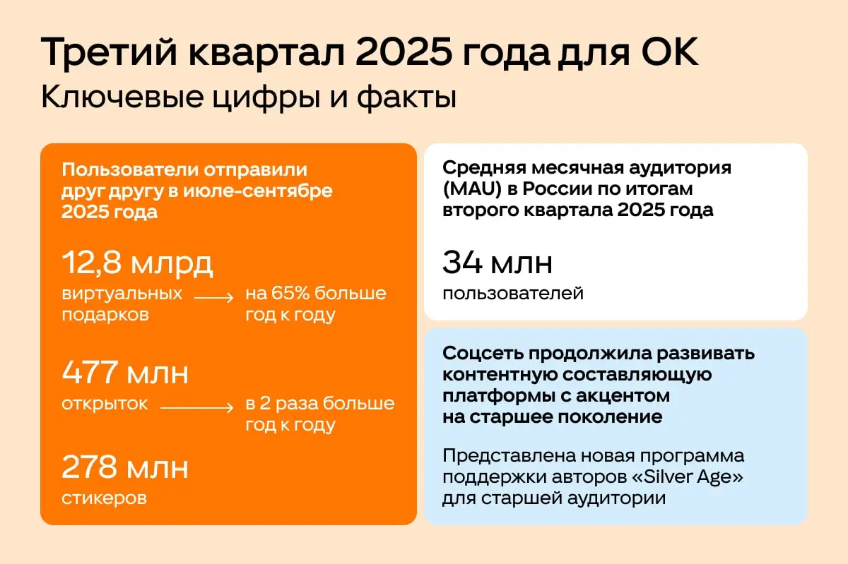 В отчёте платформы по итогам третьего квартала 2025 года средняя месячная аудитория Одноклассников в России составила около 34–36 миллионов пользователей.