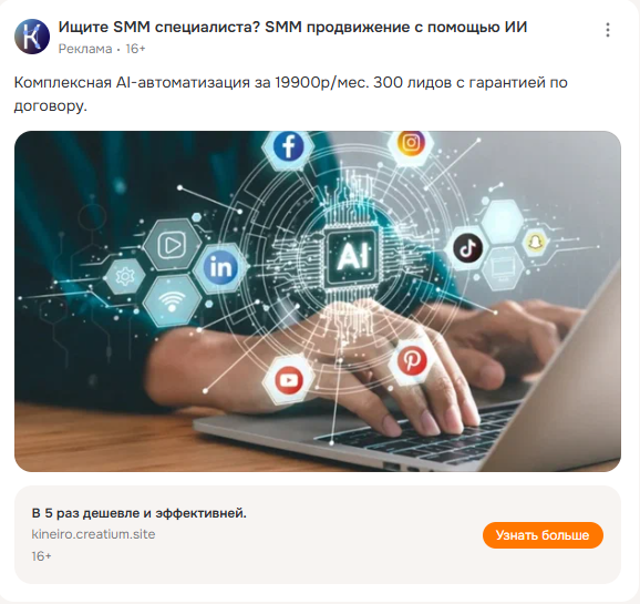 Пользователи проводят много времени в группах и обсуждениях, поэтому реклама здесь не просто показывается, а вовлекает — её читают, обсуждают и передают дальше через социальные связи.